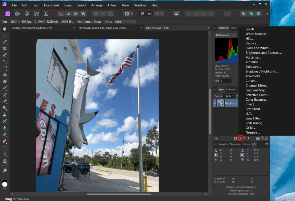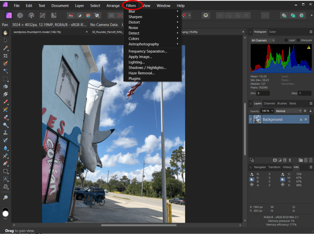 Another thing that I like about Affinity is that it saves your work in an Affinity file and preserves the history; the original file that was loaded into Affinity is not altered. When you have your final product, you export to png or whatever. You can always go back into Affinity, open the Affinity file, and return it to early states and revise.