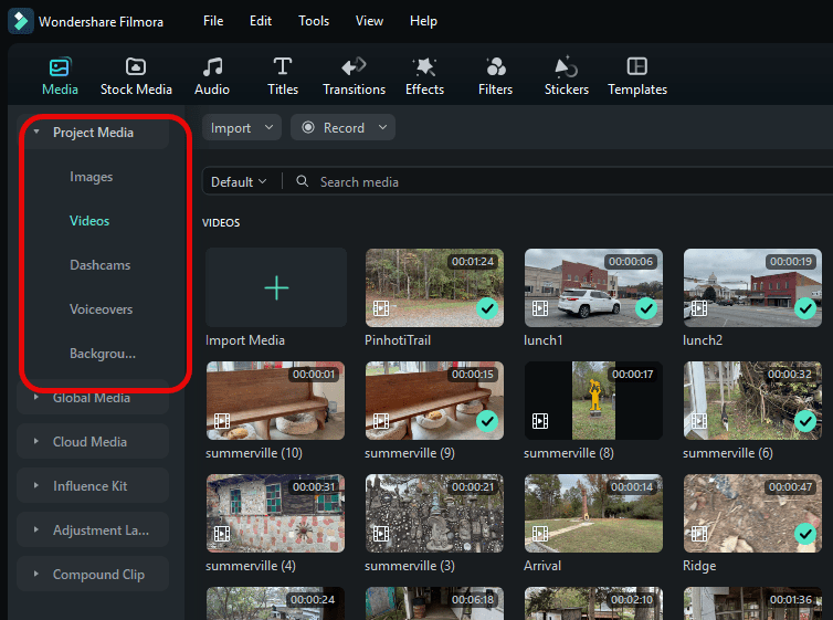 It has convenient workflow. In the upper corner of the screen, you can click on Project Media and create folders and organize them however you want. In the example below, you can see several folders I’ve created folders for still images, videos, dashcam videos, voiceovers, etc. As the files are being dropped into the timeline, they’re given a checkmark to show that the resource has been added. Later you can deleted the unchecked resources that you’re not using.
