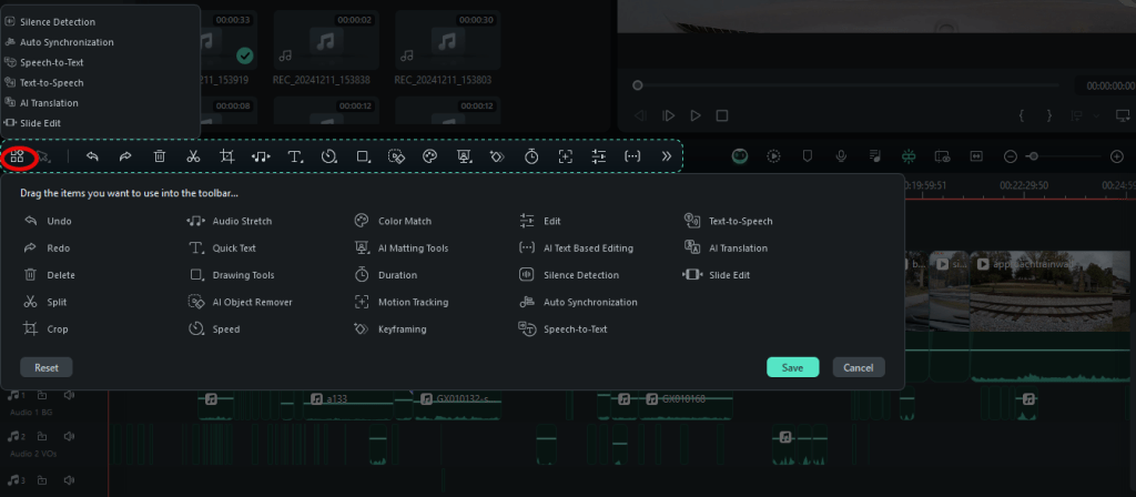 There is a bar above the timeline that provides many of the editing features. If you click the first icon on that line, you’ll see a list of the editing controls you can add to the bar for easy access.
